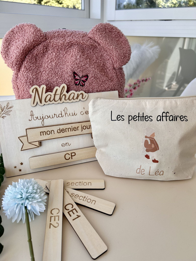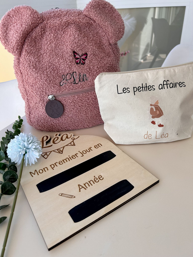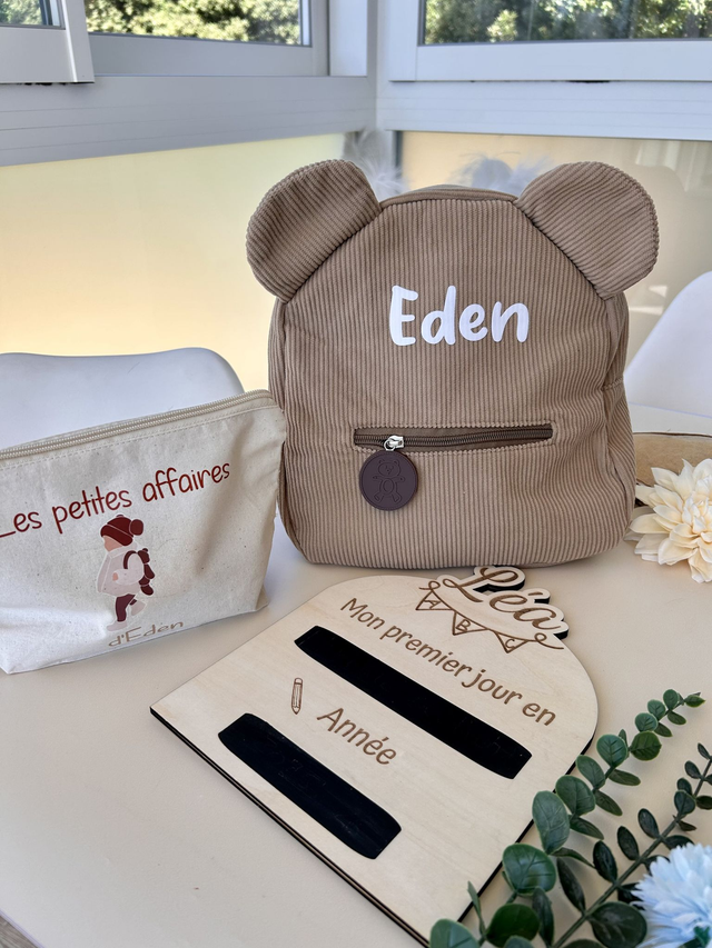 - Contient : 1 sac à dos ourson personnalisé + 1 pochette + 1 pancarte de rentrée personnalisée