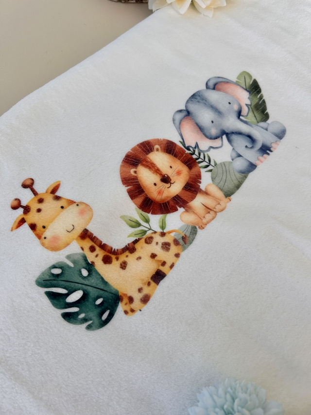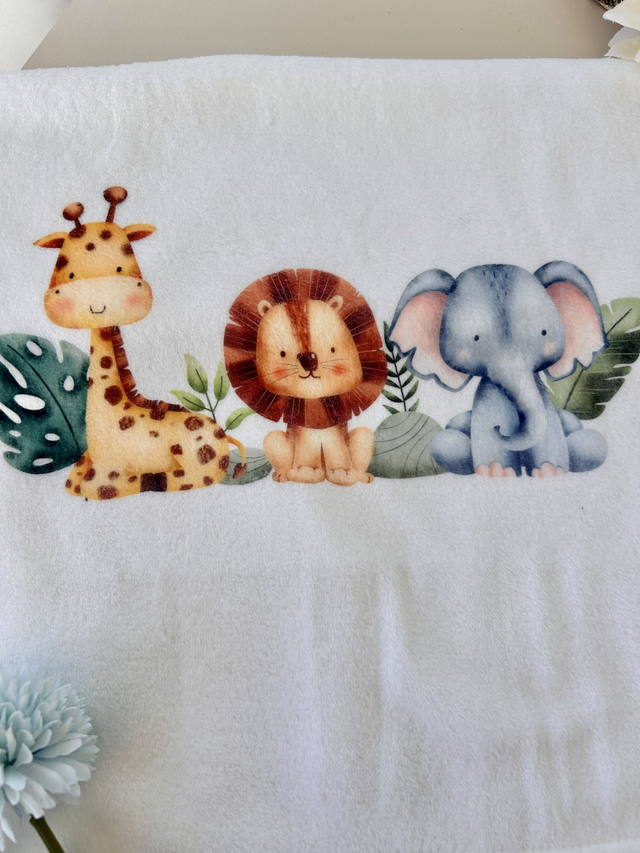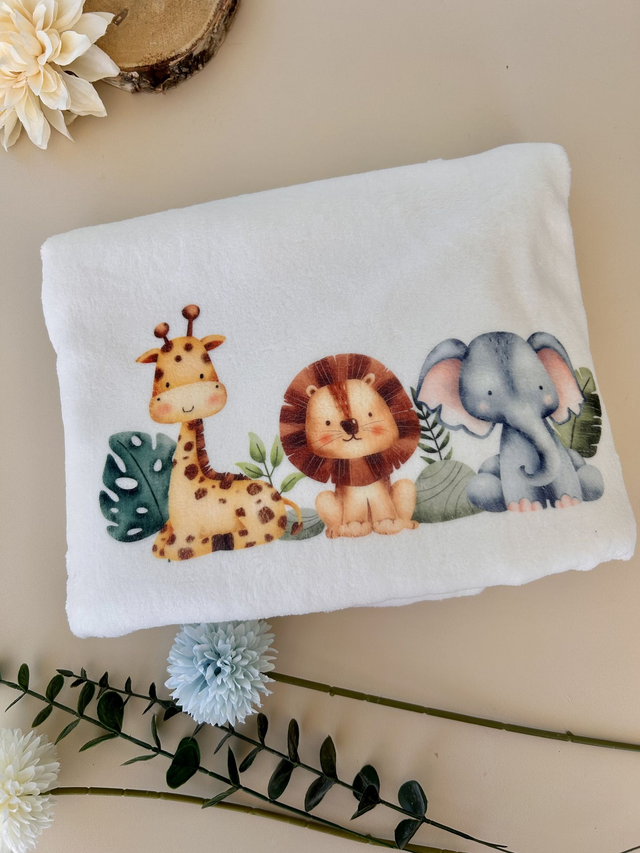 Une couverture toute douce pour envelopper bébé de tendresse dès les premiers jours avec de jolis animaux de la savane.
