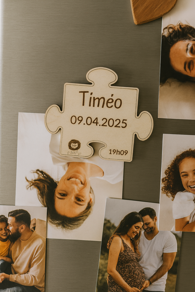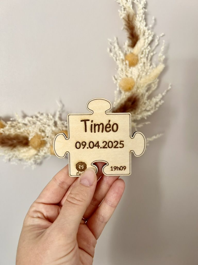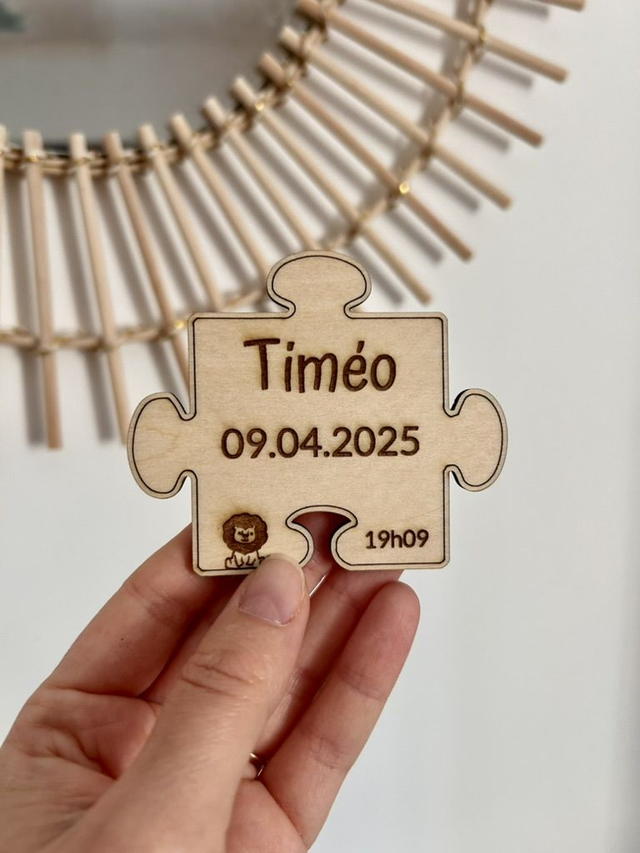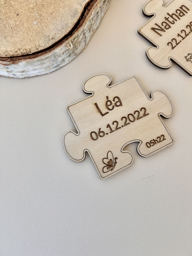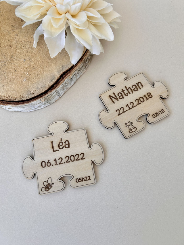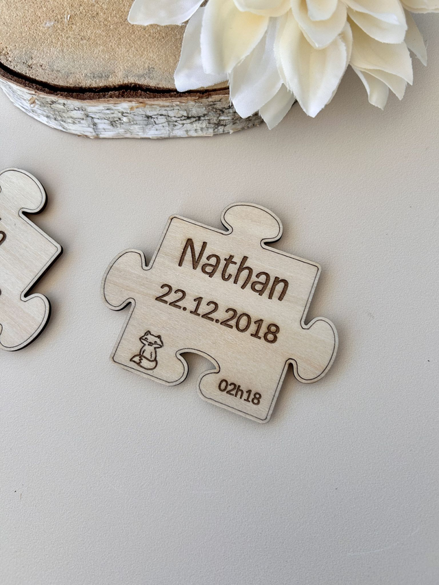 Ce magnet en forme de pièce de puzzle est gravé avec le prénom, la date et l’heure de naissance ainsi qu’un petit symbole au choix.