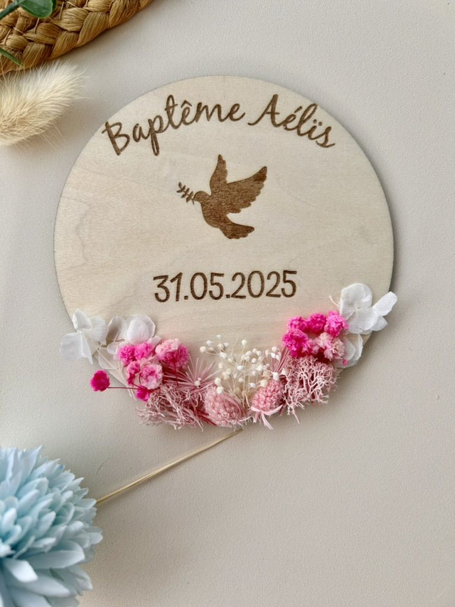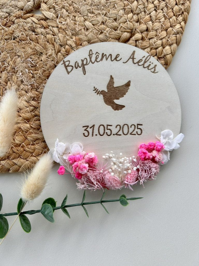 ✨ Cette pancarte de baptême personnalisée en bois de tilleul et fleurs séchées apporte une touche naturelle, poétique et symbolique à ce moment si précieux.