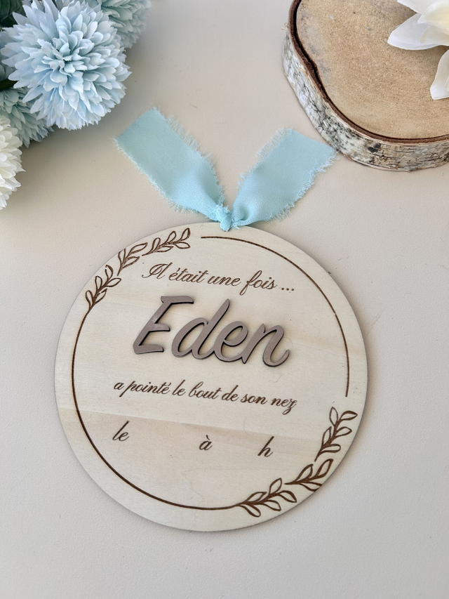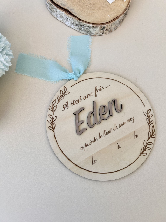 Une jolie pancarte en bois naturel, gravée de "Il était une fois" et personnalisée avec le prénom de votre choix. Idéale pour créer un souvenir de naissance unique, une belle photo ou une déco de chambre toute douce.