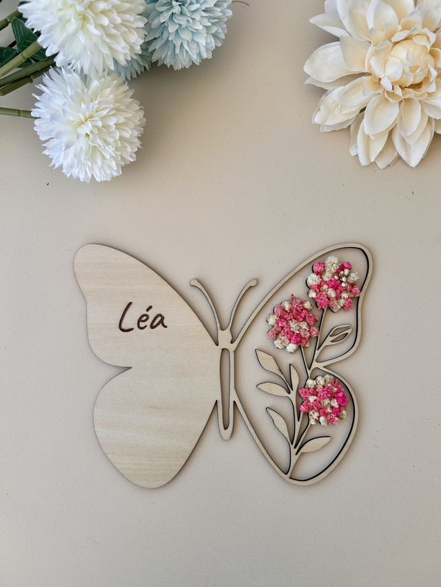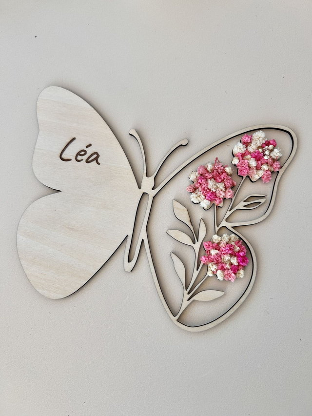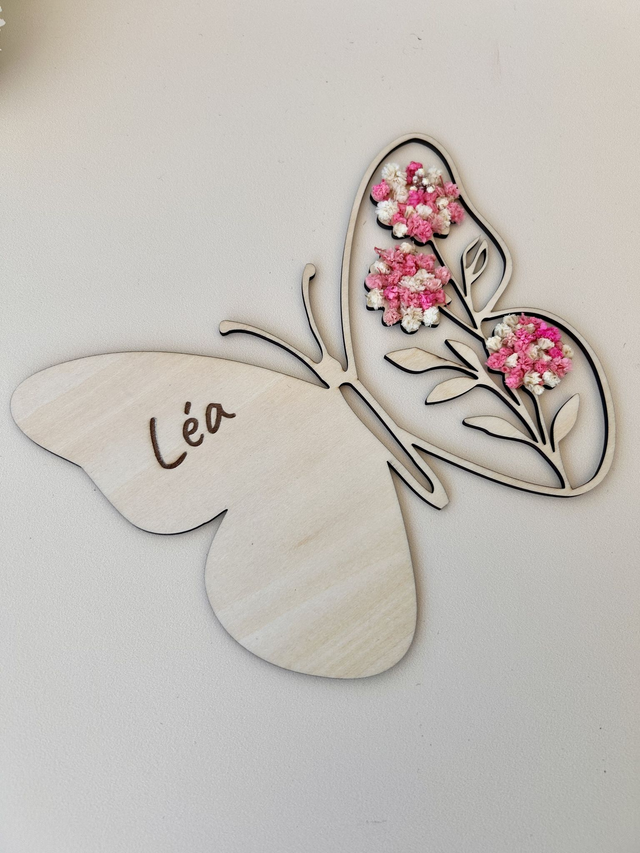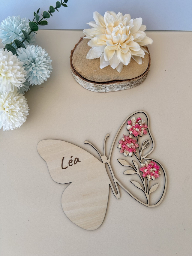 Ce papillon en bois naturel, orné de fleurs séchées, apportera une touche douce et bohème à la chambre de bébé.