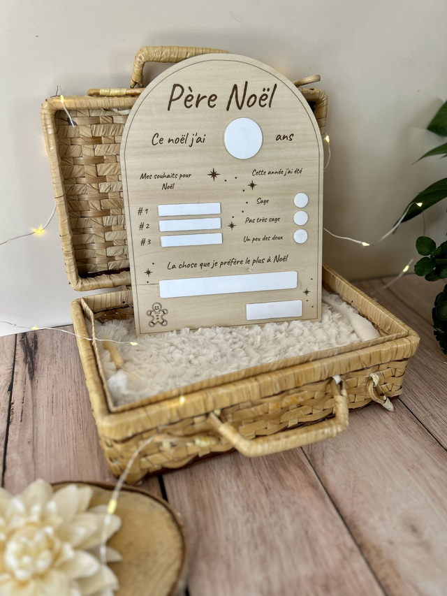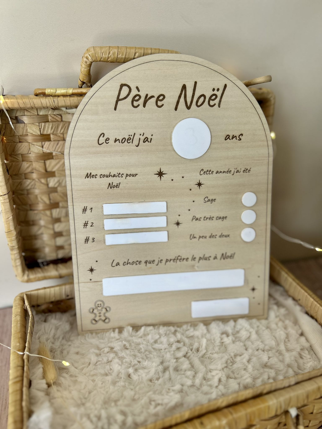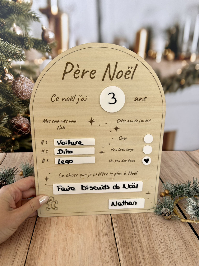 Tableau Père Noël en bois naturel – Liste de souhaits de Noël réutilisable – Décoration artisanale pour enfants 🎁